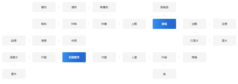 过程中,淀粉吸水膨胀,加热糊化,形成结构疏松的淀粉,在淀粉酶的作用下分解为低分子的单糖。单糖在脱羧酶、脱氢酶的催化下分解,逐渐分解形成二氧化碳和酒精。若是以淀粉为原料酿酒,需经过两个主要过程,一是淀粉糖化过程,二是酒精发酵过程。在酒的发酵过程中,窖池中会产生种类繁多的微生物和香味物质,并且慢慢地向泥窖深入渗透,变成了丰富的天然香源。